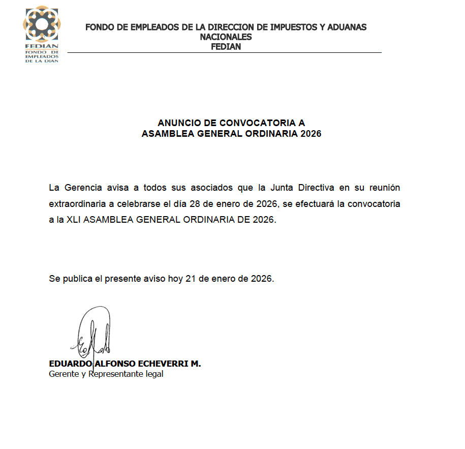 Fedian se permite adjuntar información referente a la Convocatoria XLI Asamblea Ordinaria de delegados FEDIAN 2026: